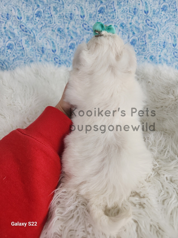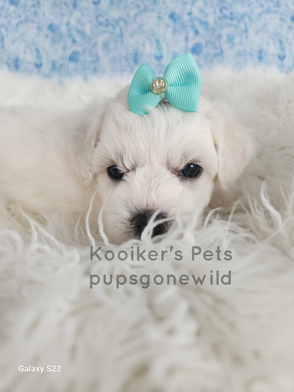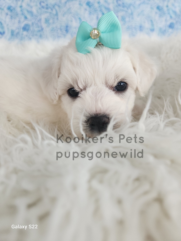 White. Has all three series of puppy vaccinations complete. This little fella loves to run around and play but also curl up in your lap.