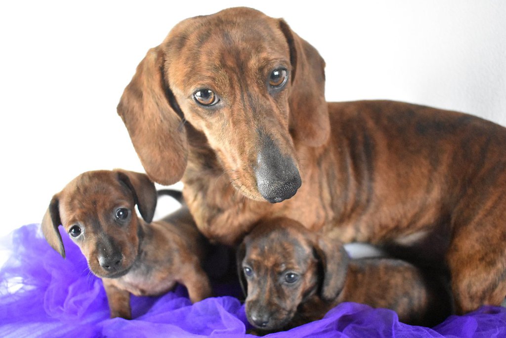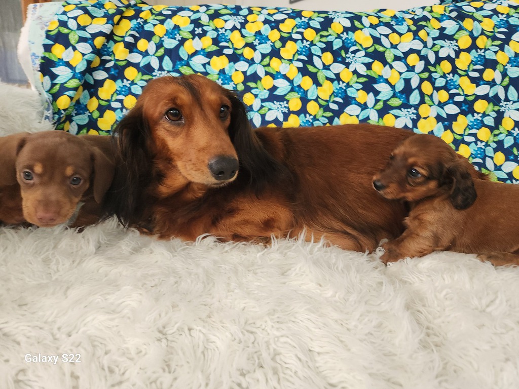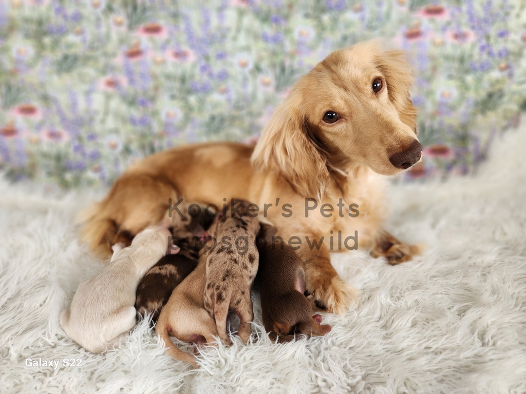 typically have long-haired and short-haired. The colors we most often have are shaded red, black and tan, brindle, dapple, chocolate and tan, and sometimes piebald.