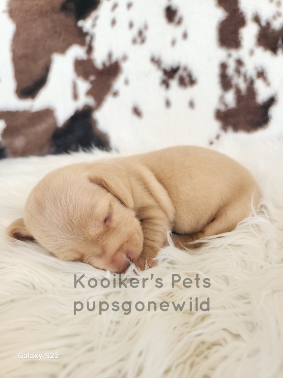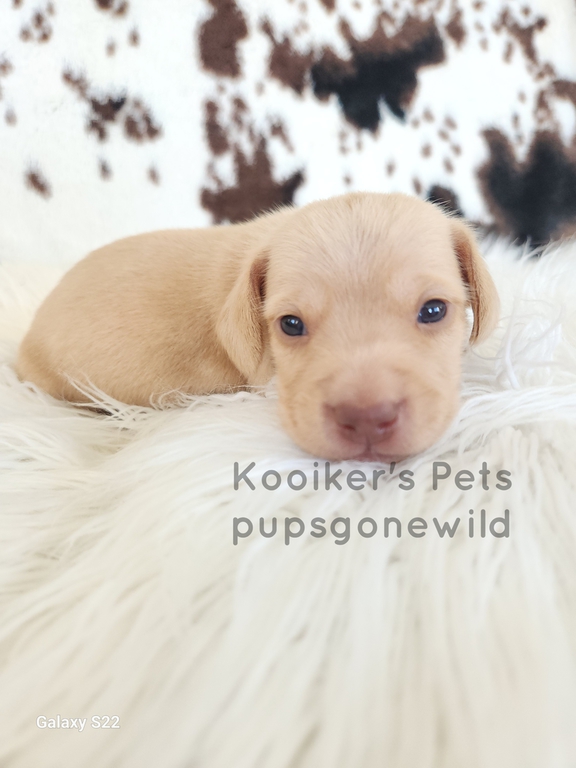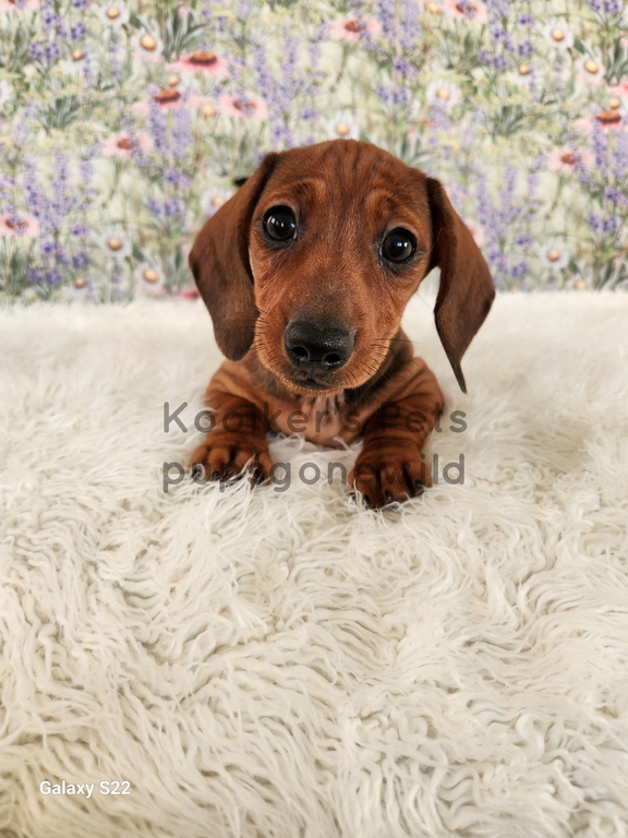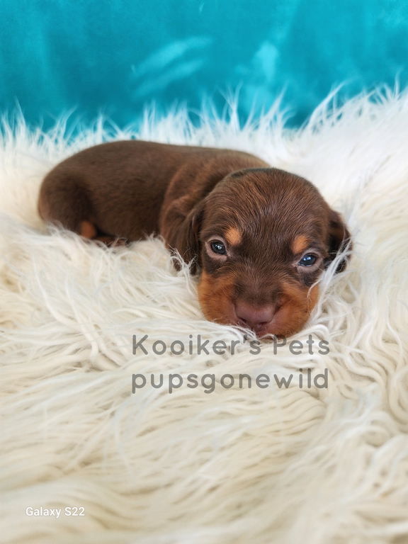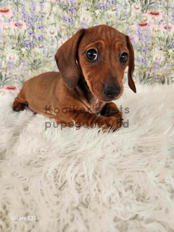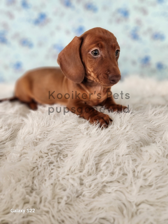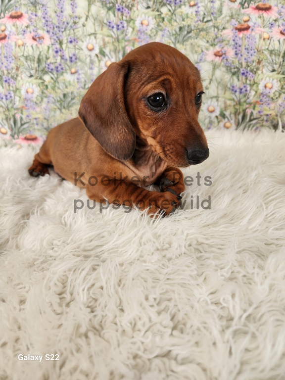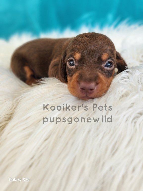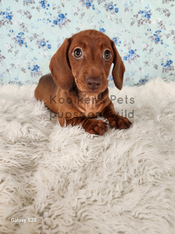 Chocolate base Shaded Red Shorthaired. Has two series of puppy vaccinations.