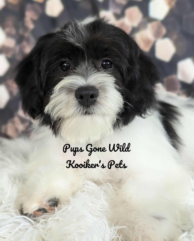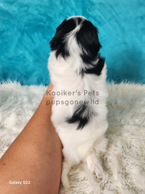 Black/White. Has had all three series of puppy vaccinations complete. He is a complete lover and looooves people's affection. SO personable, he just wants to be with you all the time.